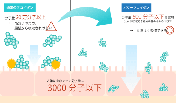 濃縮もずくエキスを特殊製法によって低分子に加工(約500分子量以下)し、体内の細胞が吸収できる大きさよりさらに6分の1の大きさになっているため体内へ栄養成分が吸収しやすく効率良く摂取いただけます。